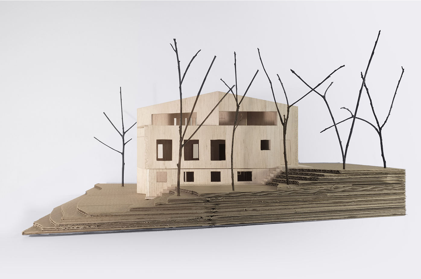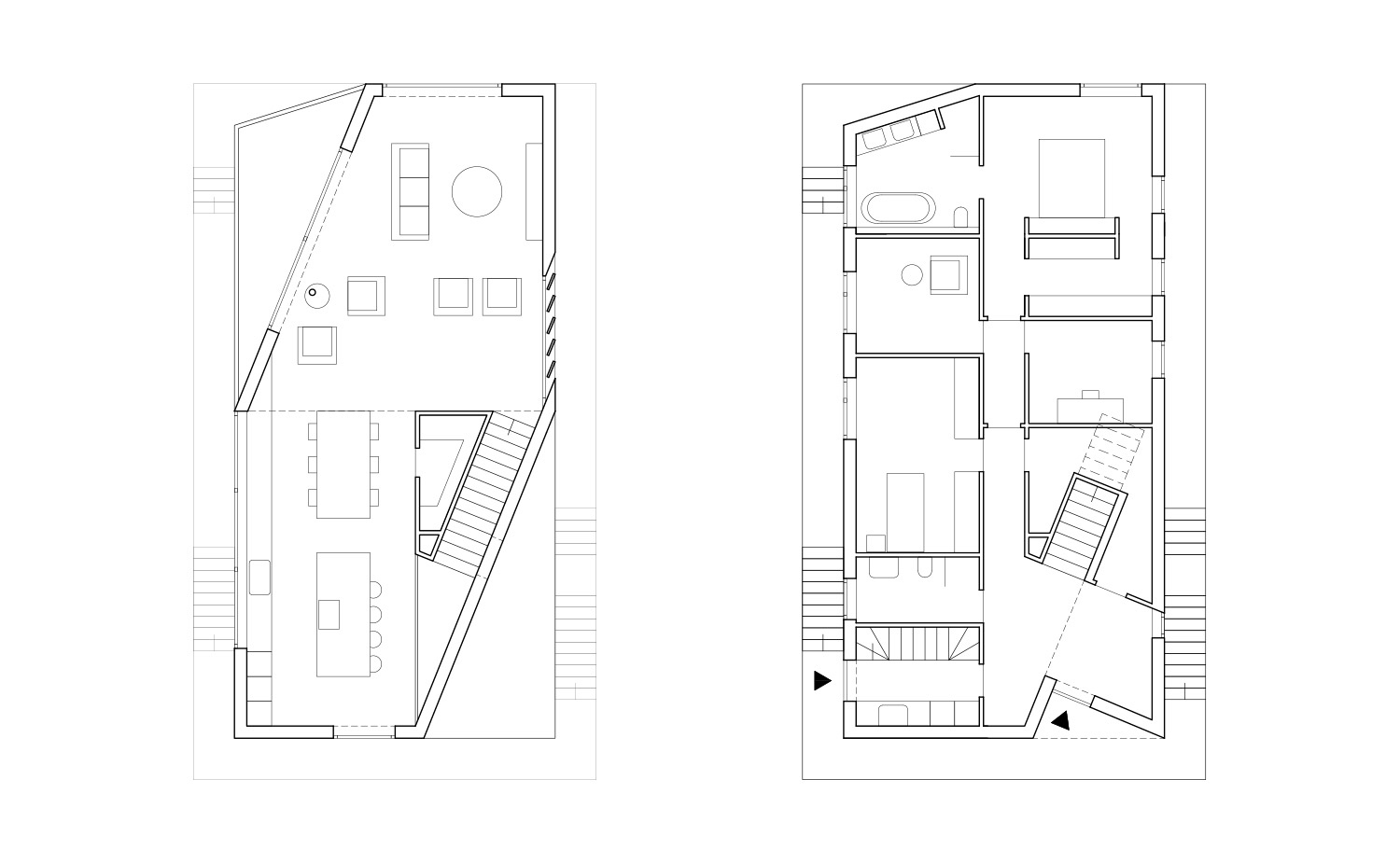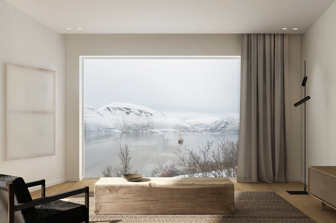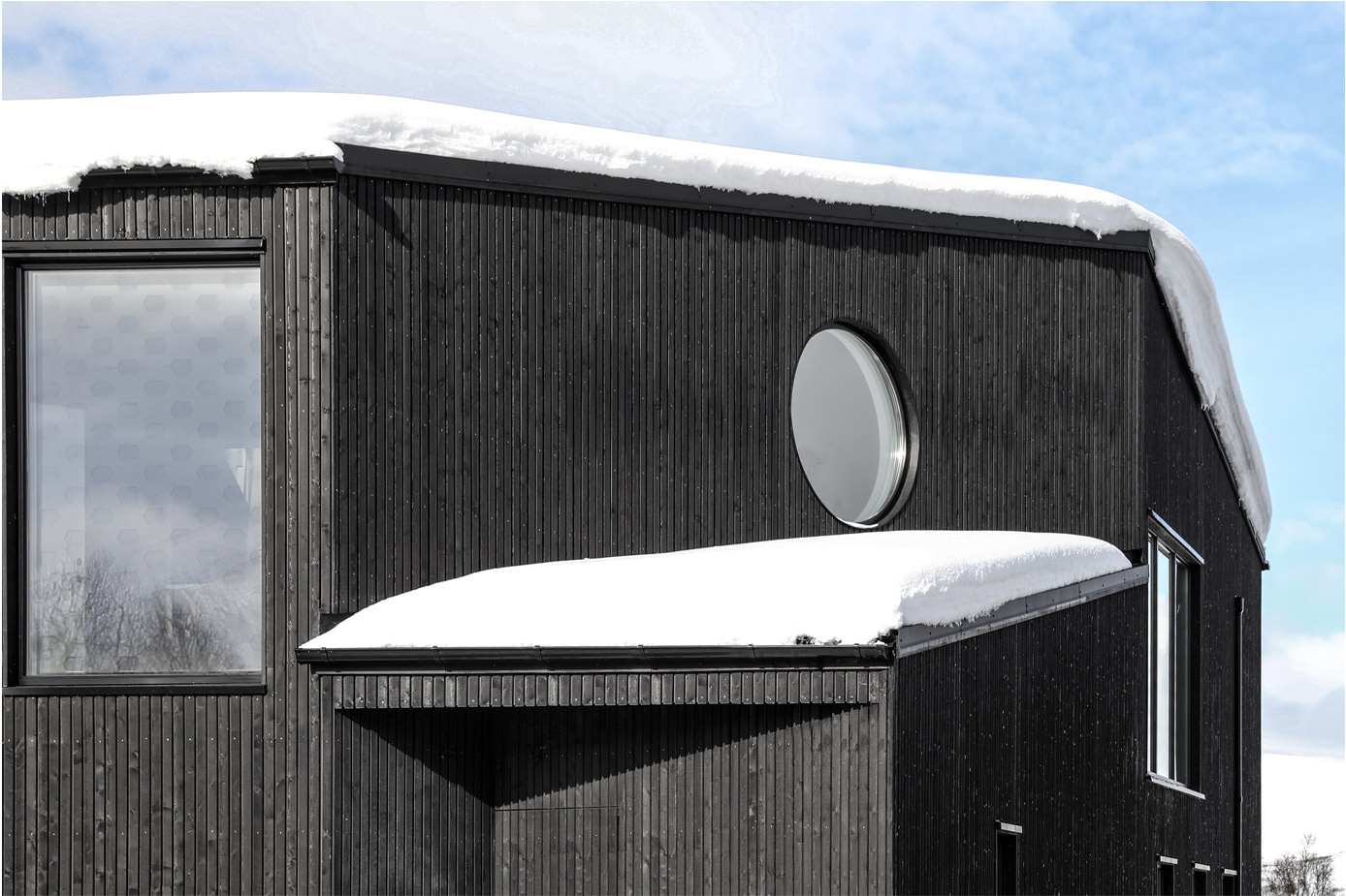 The plot is placed in a quiet suburban neighbourhood at the southwest of Tromsøya, with a beautiful view overlooking Kvaløysletta and its mountains behind. The project is for a private client whose request is to have 2 floors for his home and a ground floor for smaller rental apartments. The entrance is in the intermediate level, where the bedrooms and recreational rooms are. The beauties of the surrounding landscape are best visible from the top floor, where the living room and the kitchen find their separate spaces, organized around a structural and functional volume. It is covered by a pitched roof with double inclination, to fit the local regulations and to better harmonize with the neighbouring houses. The mass of the top floor is modelled through subtractions; at the south, the wall bends to allow the roof to be lowered and aligned with the one of the neighbouring house, at the north it opens up for a small terrace in the direction of the best views.