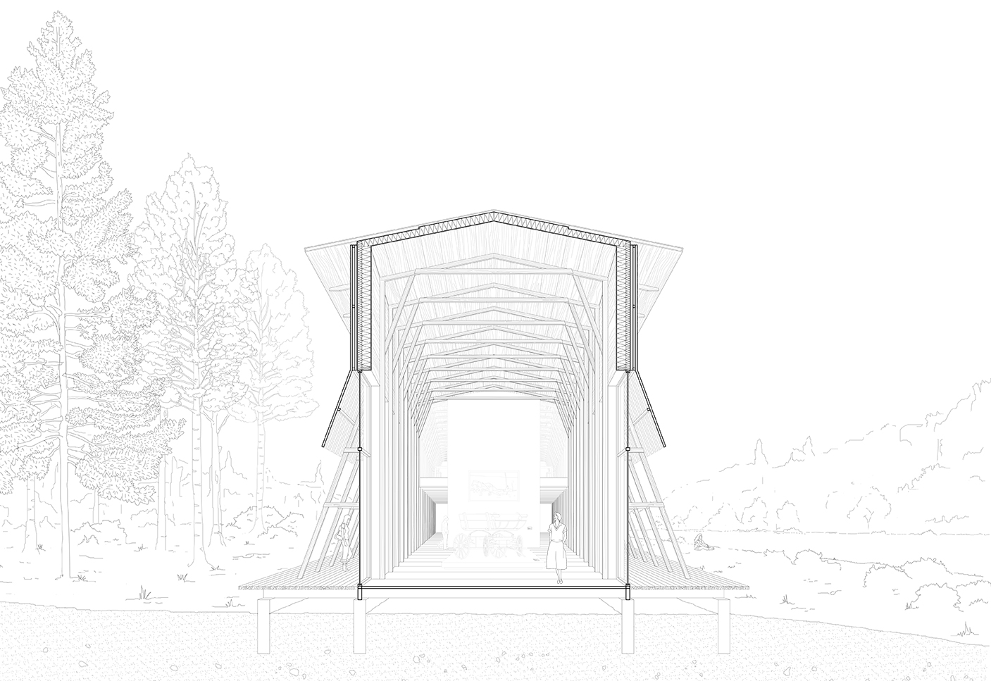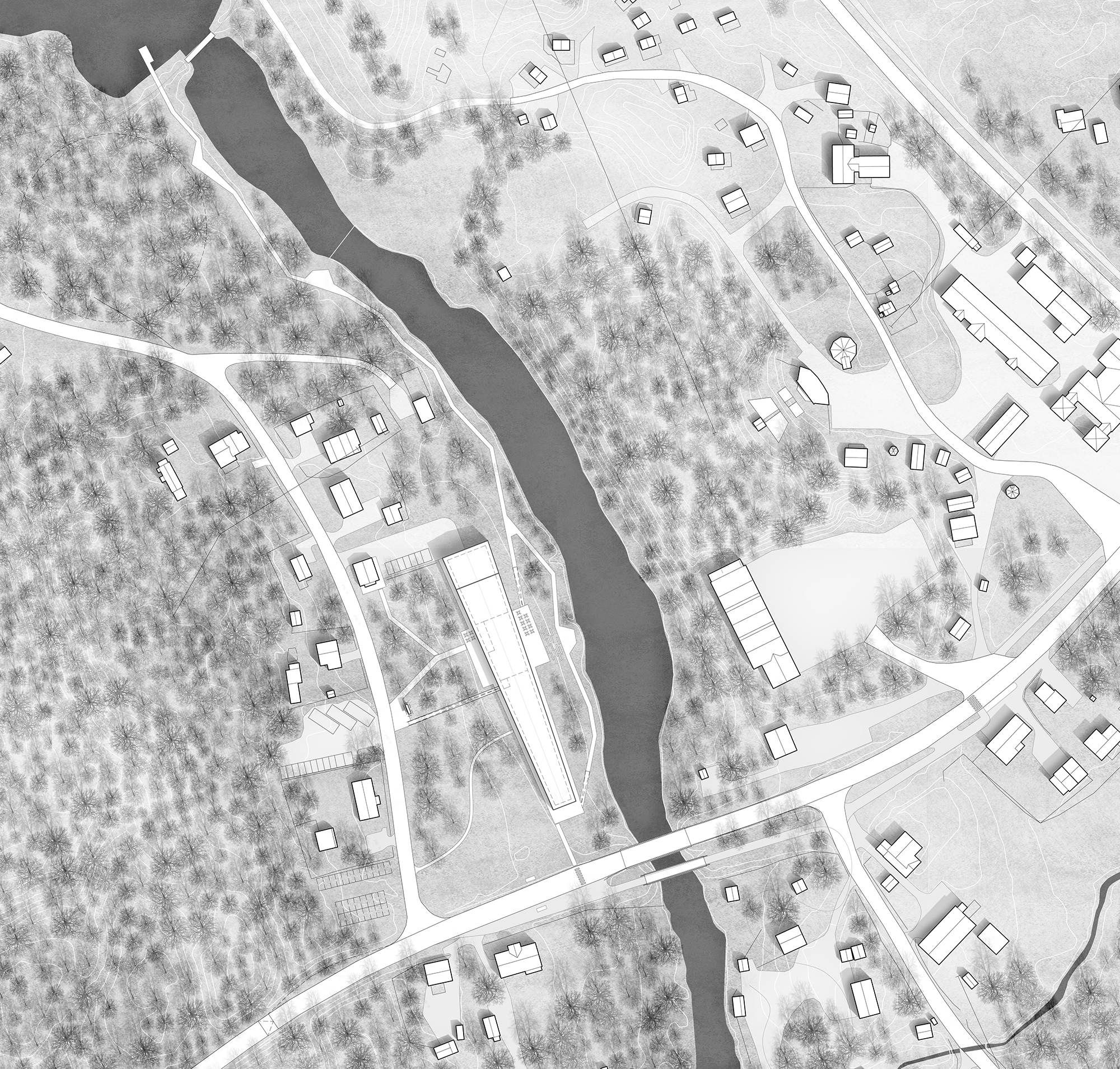 The Forest Finns Museum sits on the west bank of Rotna, integrated among the existing trees, in close relation with the river on one side and the forest on the other side. It works on three volumes, one dedicated to the exhibition spaces, one to auditorium and storages and a central core occupied by a double height foyer, that acts as a connector.