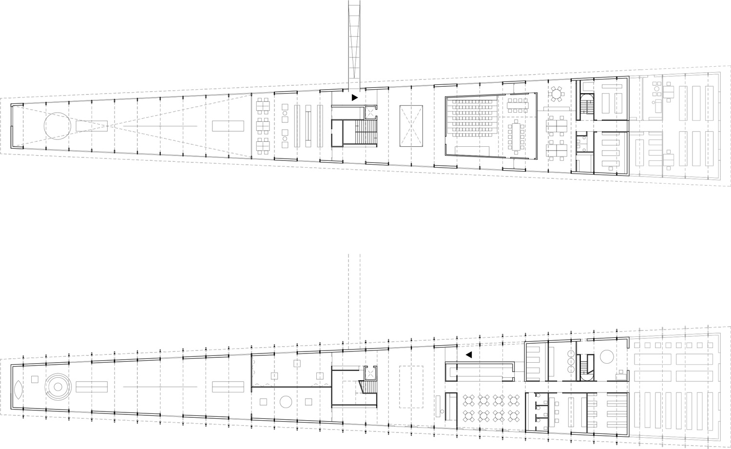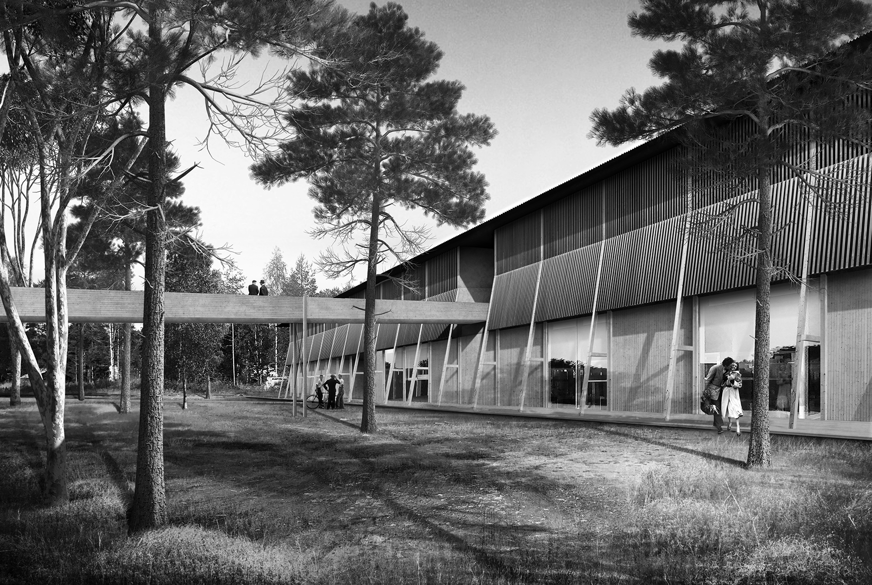The “wedge” shaped plan optimizes the spaces in terms of functionality and of structural span. The roof unifies the volumes in an enlongated and distorted rectangle. When perceived from a distance, the volume balances its horizontality with the verticality of the surrounding trees. When perceived from nearby, the facade finds its proportions in the exchange between transparencies and masses, marked by the rhythm of the exposed structure.