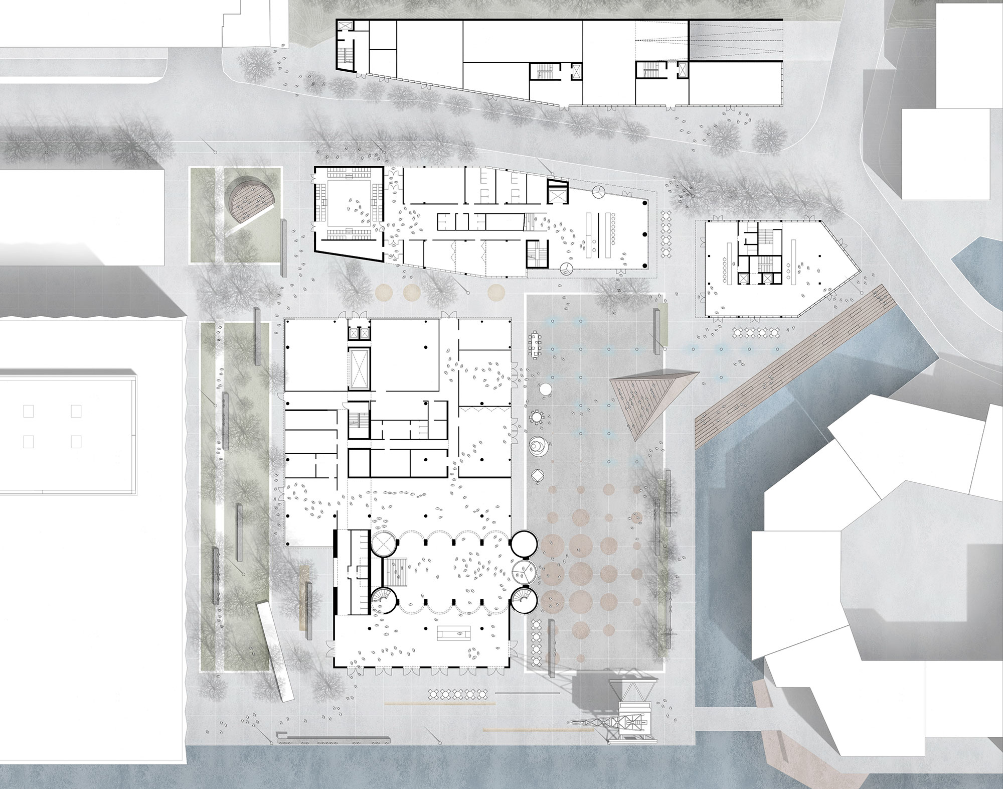 The project proposes to remove part of the silo building, which is an historical landmark of the city and an important document of the Norwegian industrial heritage, taking it back to its original iconic 1935 version, to find a harmonic relationship with the scale of the surroundings and to establish a large attractive urban square, the Kulturtorget. The built borders of the square will all be qualified with activities and functions to produce lively interactions between interior and exterior spaces, providing a basis for a strong synergy between activities and users; the entire masterplan project supports the idea of a very open and public system of buildings with smooth transitions between inside and outside, defining the area’s connection both with the city and the close surroundings.