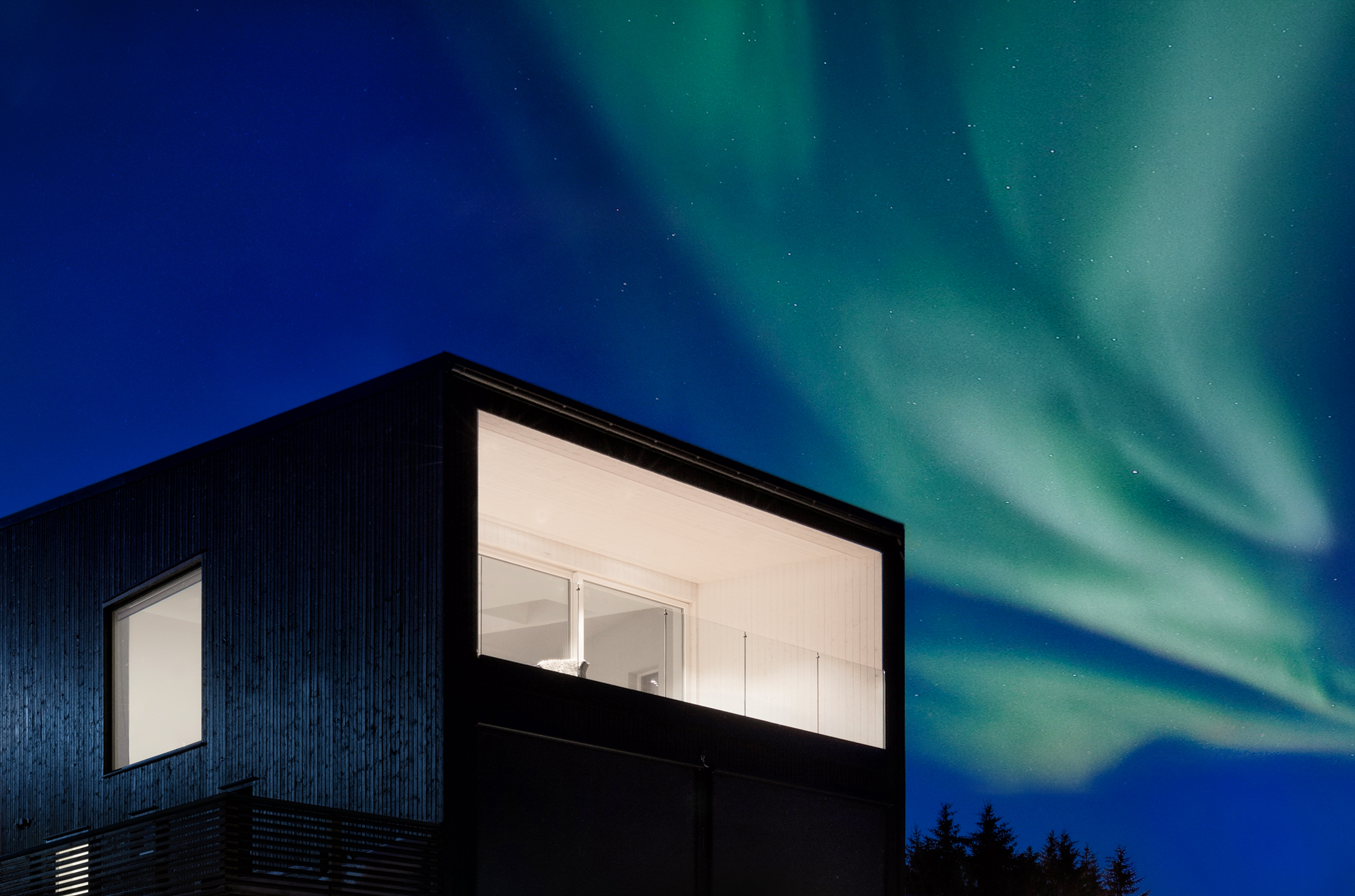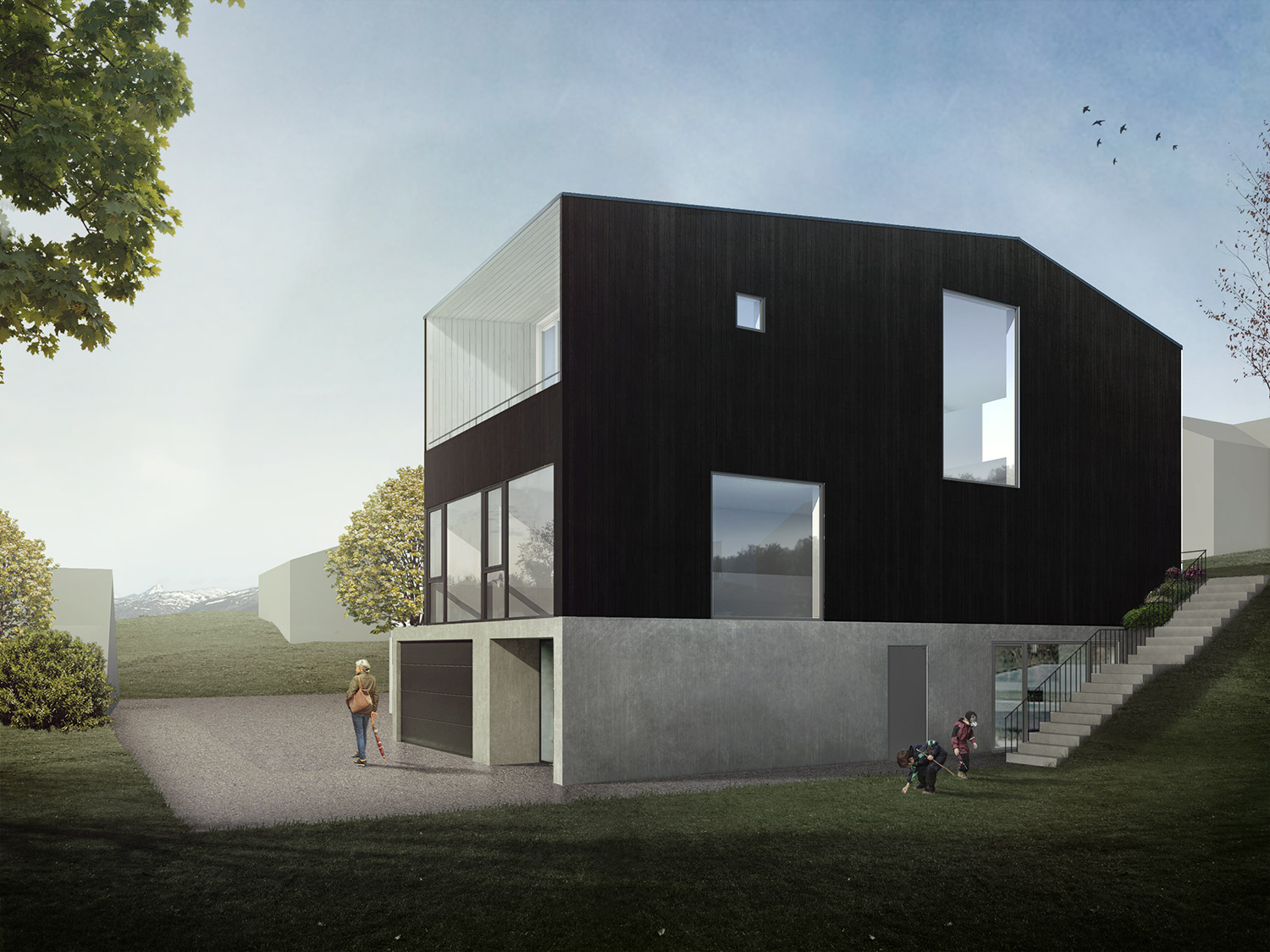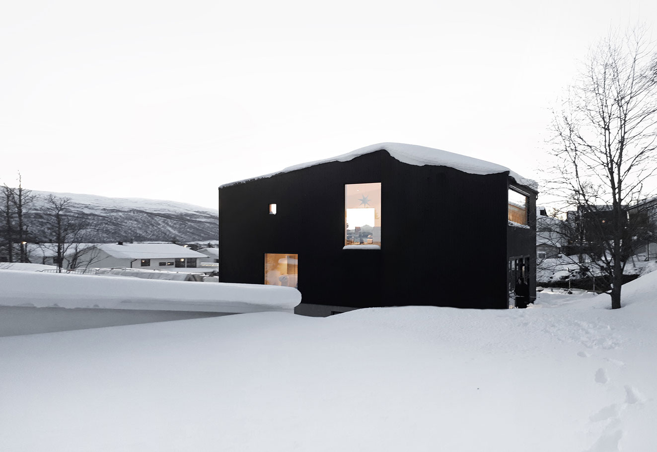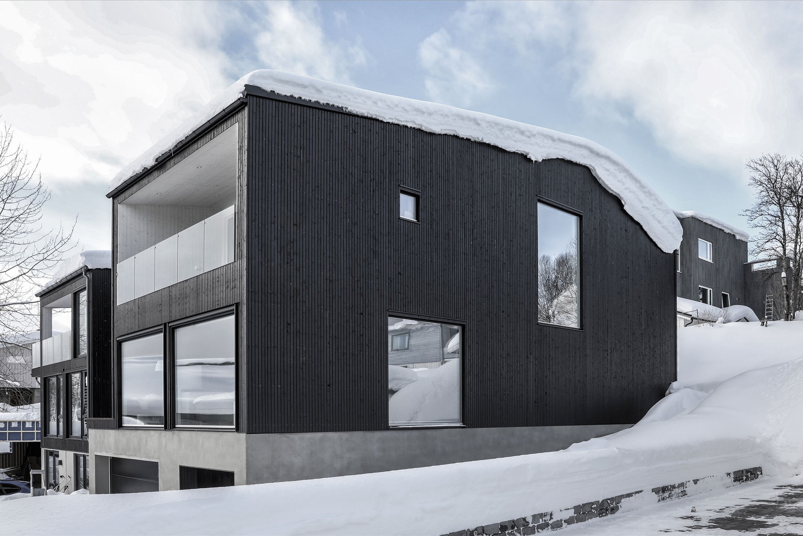Martin Urdals Veg is a picturesque suburban street in the middle of Tromsø, in one of the highest points of the island, close to the Prestvannet Lake. The project is designed from the outside in, due to the restrictions given by the building regulation, mostly concerning the volume shape and height. The sun presence and the climate are both very extreme in Tromso, bringing the project to work on the balance between openness towards the exterior and privacy on the sides facing the surrounding neighbours. The circulation sequence that connects the different levels of the house affects the presence of the apertures, with large windows that provide view and light to the vertical connections and to the rest of the circulation spaces. The whole house has a directionality that enhances the feeling of being connected to the view towards the west, framed into the large openings of the upper floor. The black cladding of the walls and roofs provides a compact clean appearance while improving the solar gain of the house. In contrast with the darkness of the exterior, clean and light materials are used on the interior surfaces.