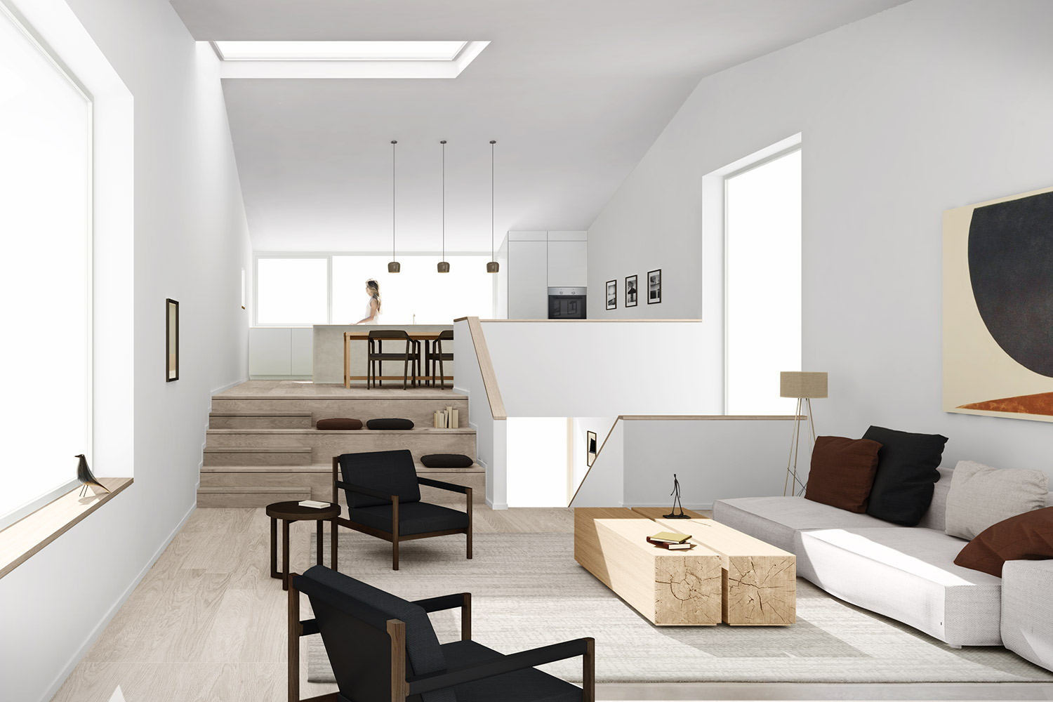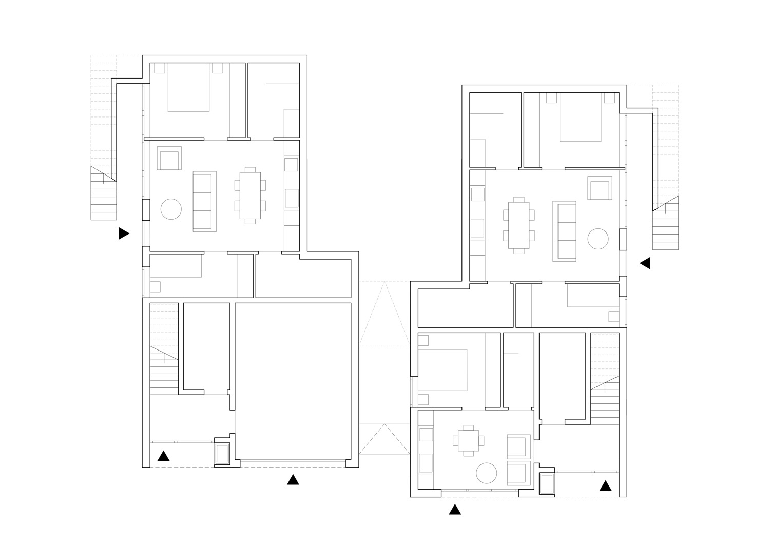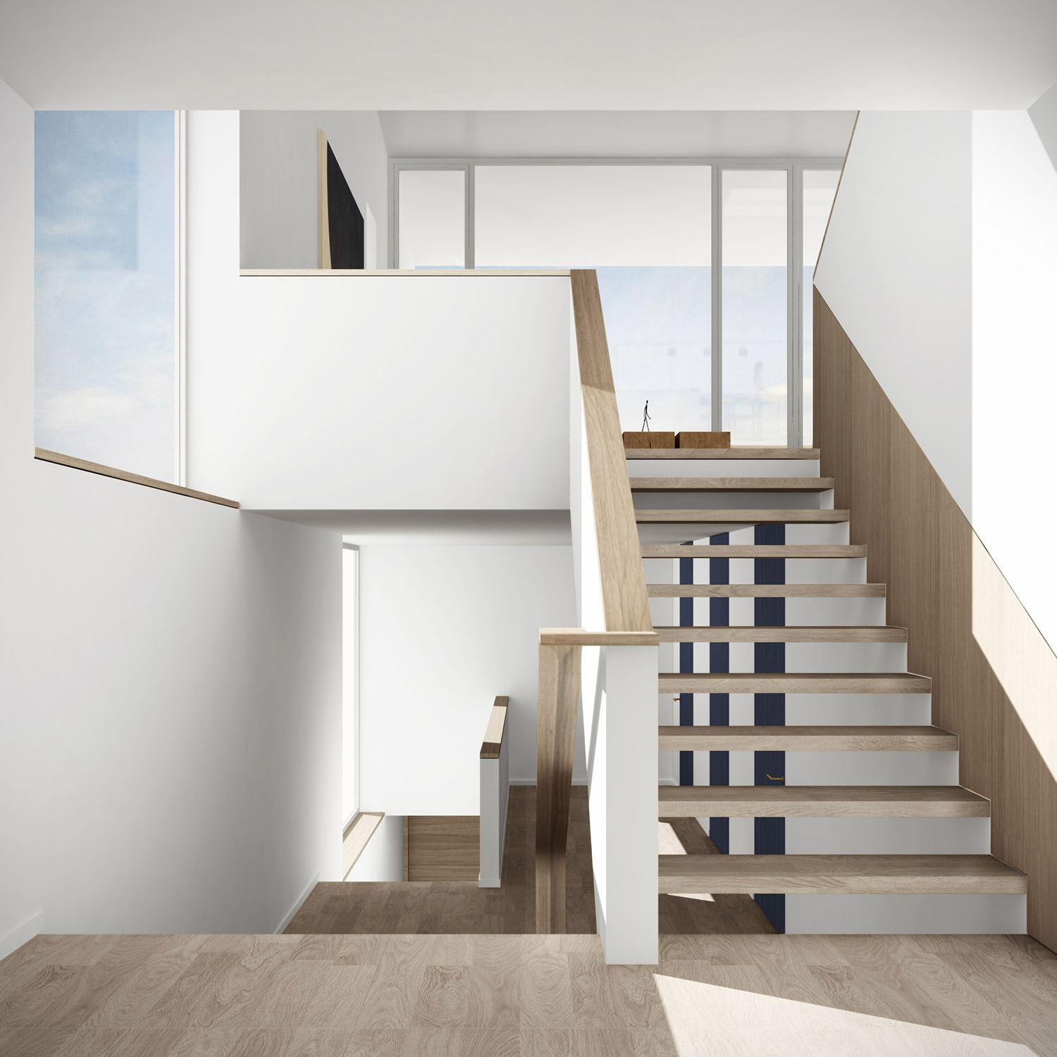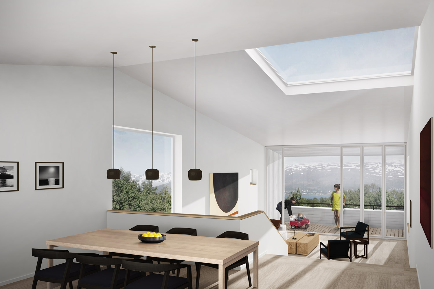 Martin Urdals Veg is a picturesque suburban street in the middle of Tromsø, in one of the highest points of the island, close to the Prestvannet Lake. The project is designed from the outside in, due to the restrictions given by the building regulation, mostly concerning the volume shape and height. The sun presence and the climate are both very extreme in Tromso, bringing the project to work on the balance between openness towards the exterior and privacy on the sides facing the surrounding neighbours. The circulation sequence that connects the different levels of the house affects the presence of the apertures, with large windows that provide view and light to the vertical connections and to the rest of the circulation spaces. The whole house has a directionality that enhances the feeling of being connected to the view towards the west, framed into the large openings of the upper floor. The black cladding of the walls and roofs provides a compact clean appearance while improving the solar gain of the house. In contrast with the darkness of the exterior, clean and light materials are used on the interior surfaces.