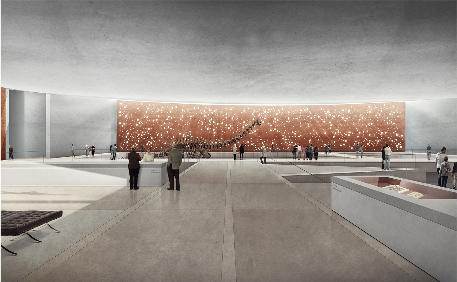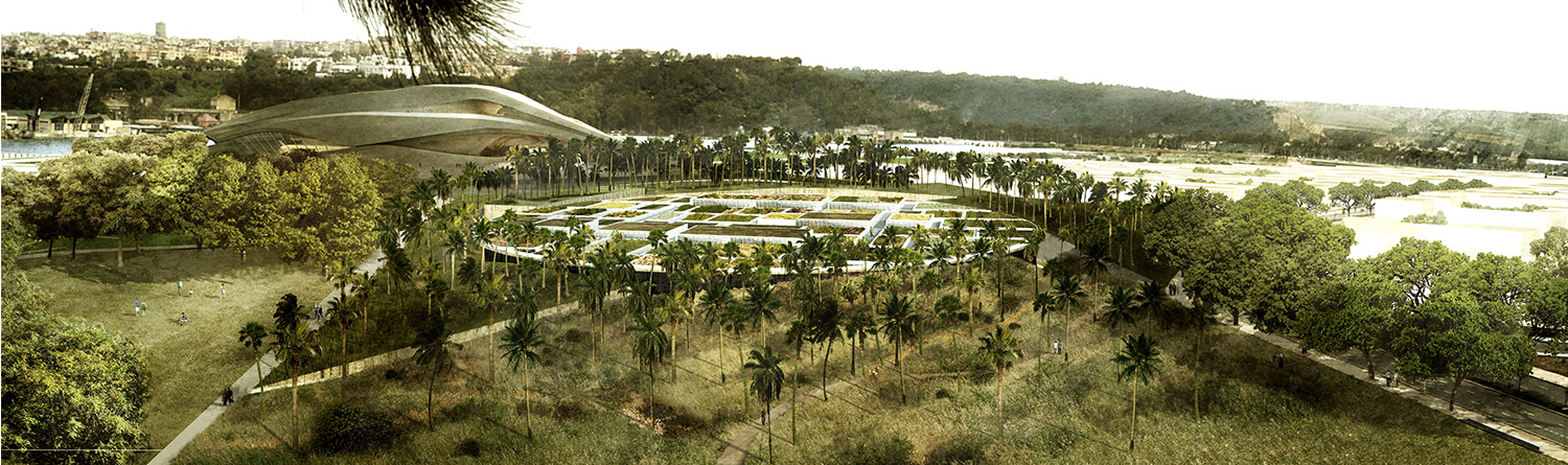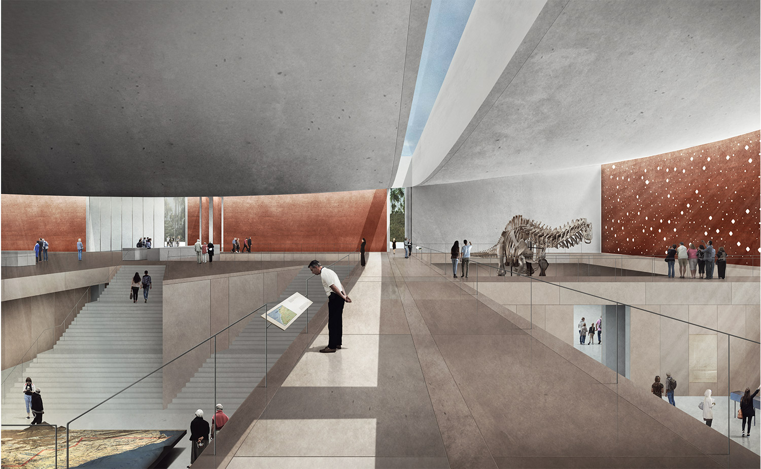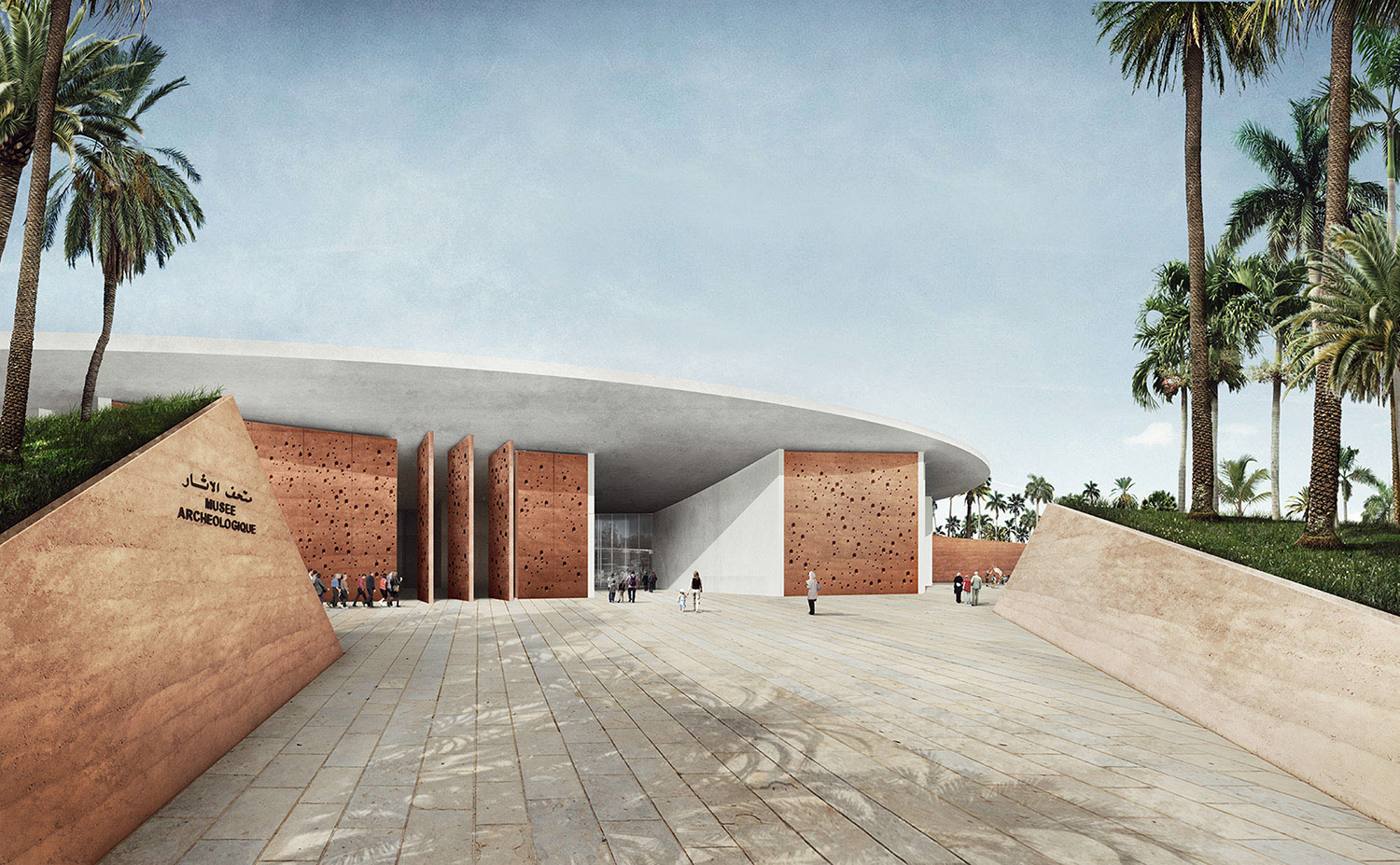 The circular shape building, draws a covered area, precise, informed and inspired by oasis gardens, and offers the possibility of an exceptional space. A quality public space outside that welcomes visitors. The circular projection of the big roof provides protection from intense sunlight and create an open air gallery that anticipates the extraordinary exhibition inside. Indoor space is characterized by an exhibition space with differences layers, recalls specific soil geological sections of the territory. At the top, a botanical garden roof create a fresh and fragrant outdoor space, open to the sky, making the museum deeply related to the park all around. The place will be designed to tell the story of the Moroccan landscape, through interventions able to illustrate environments and images that convey a deep and wonderful didactic message.